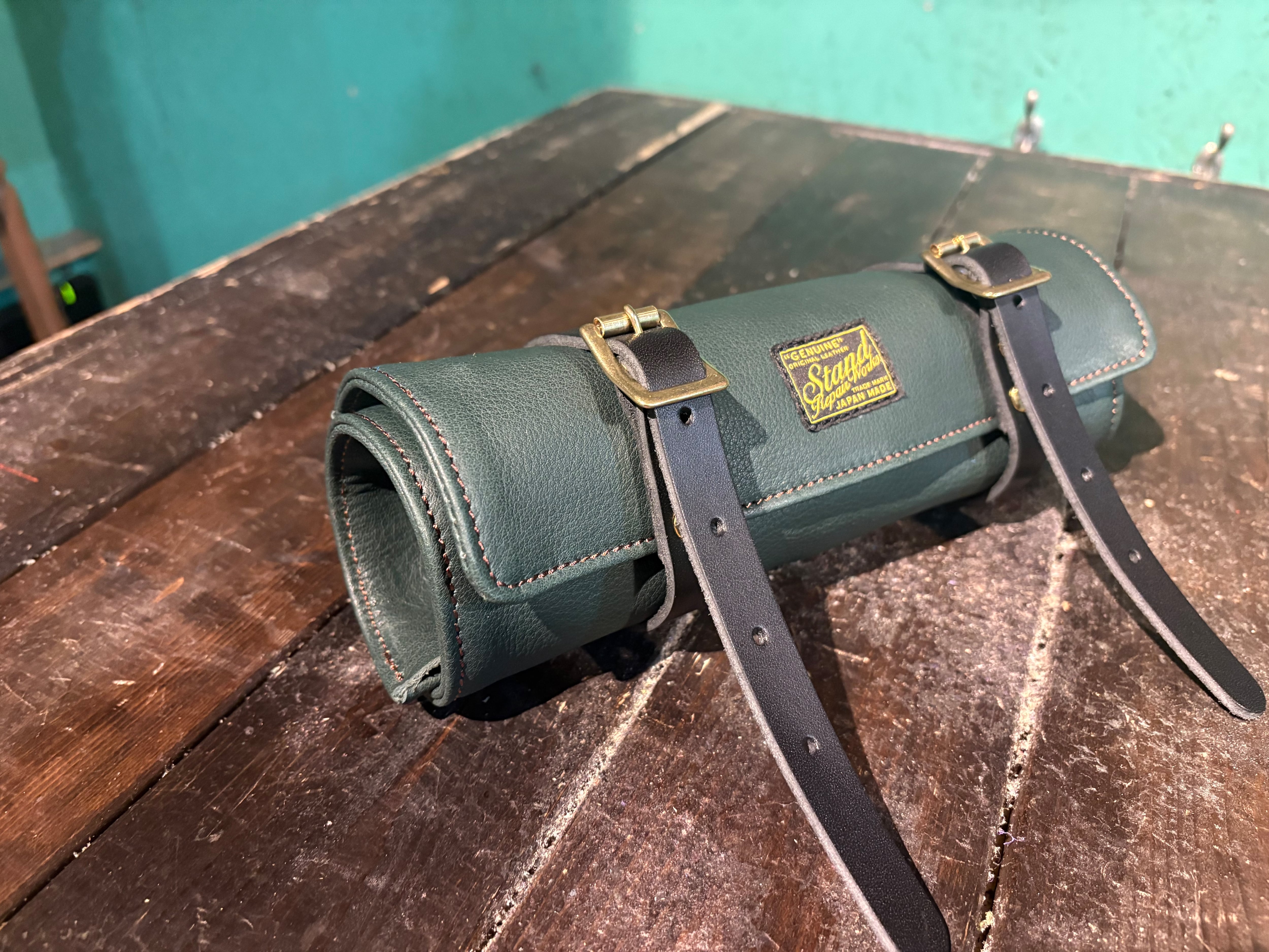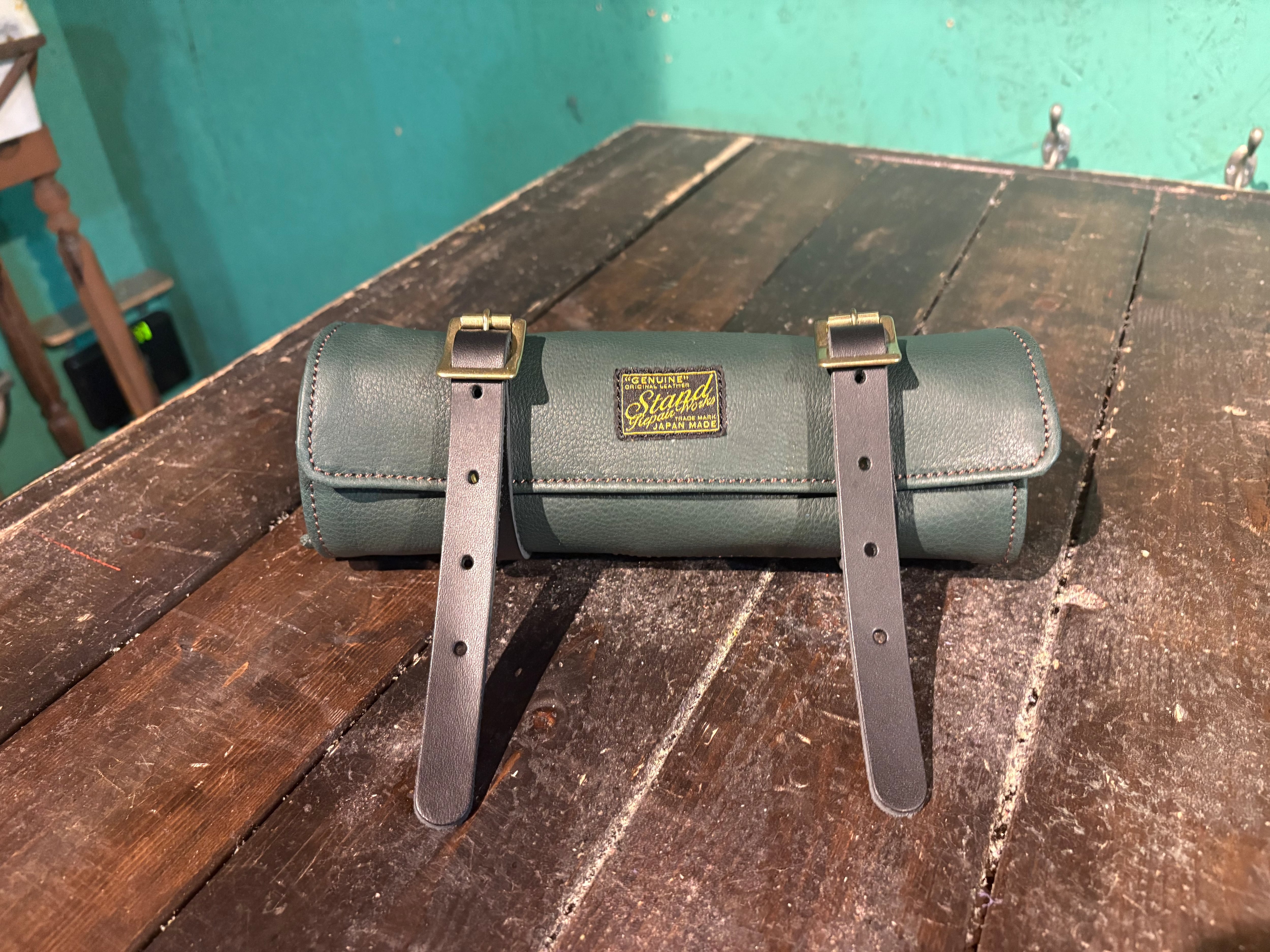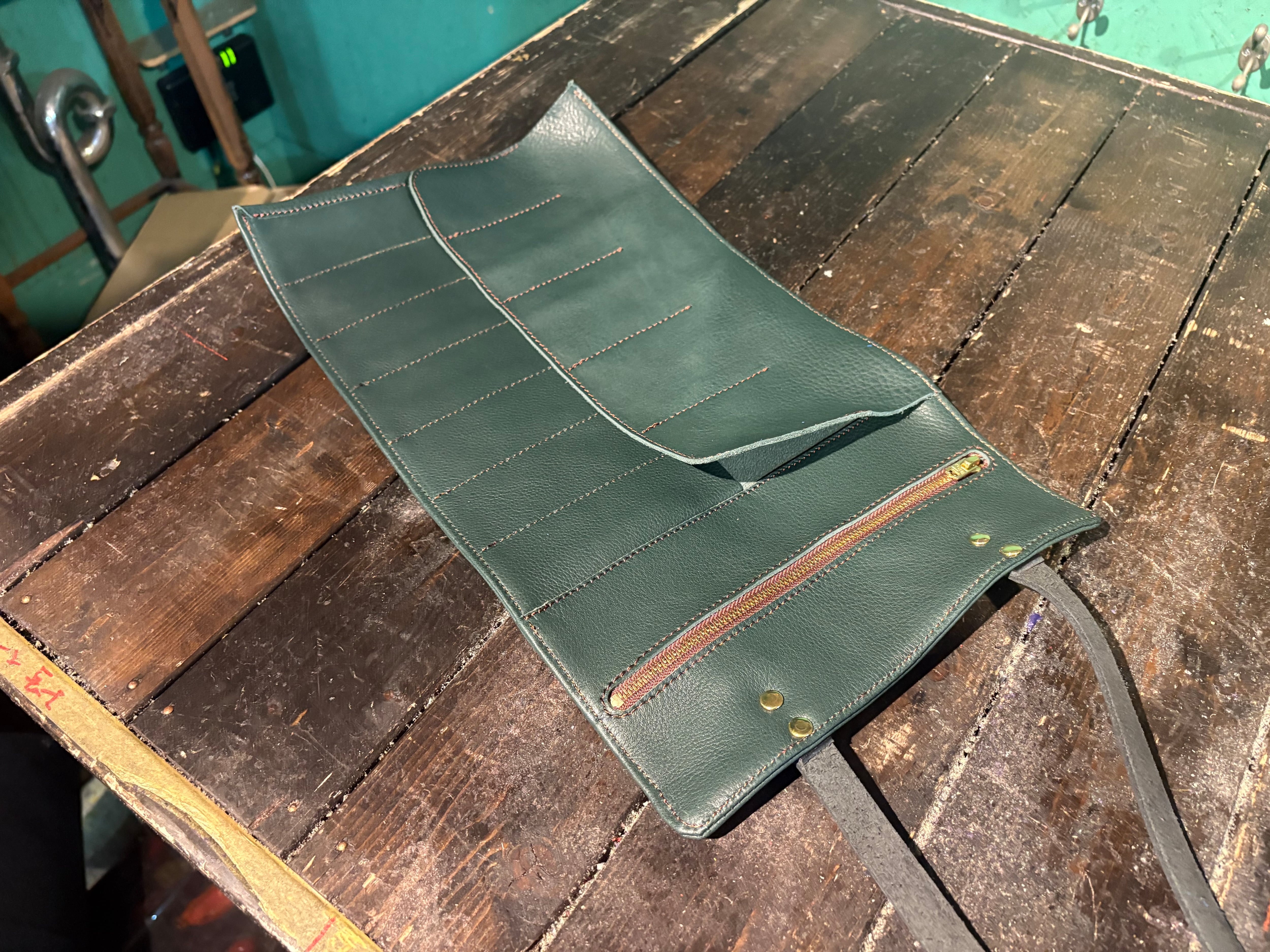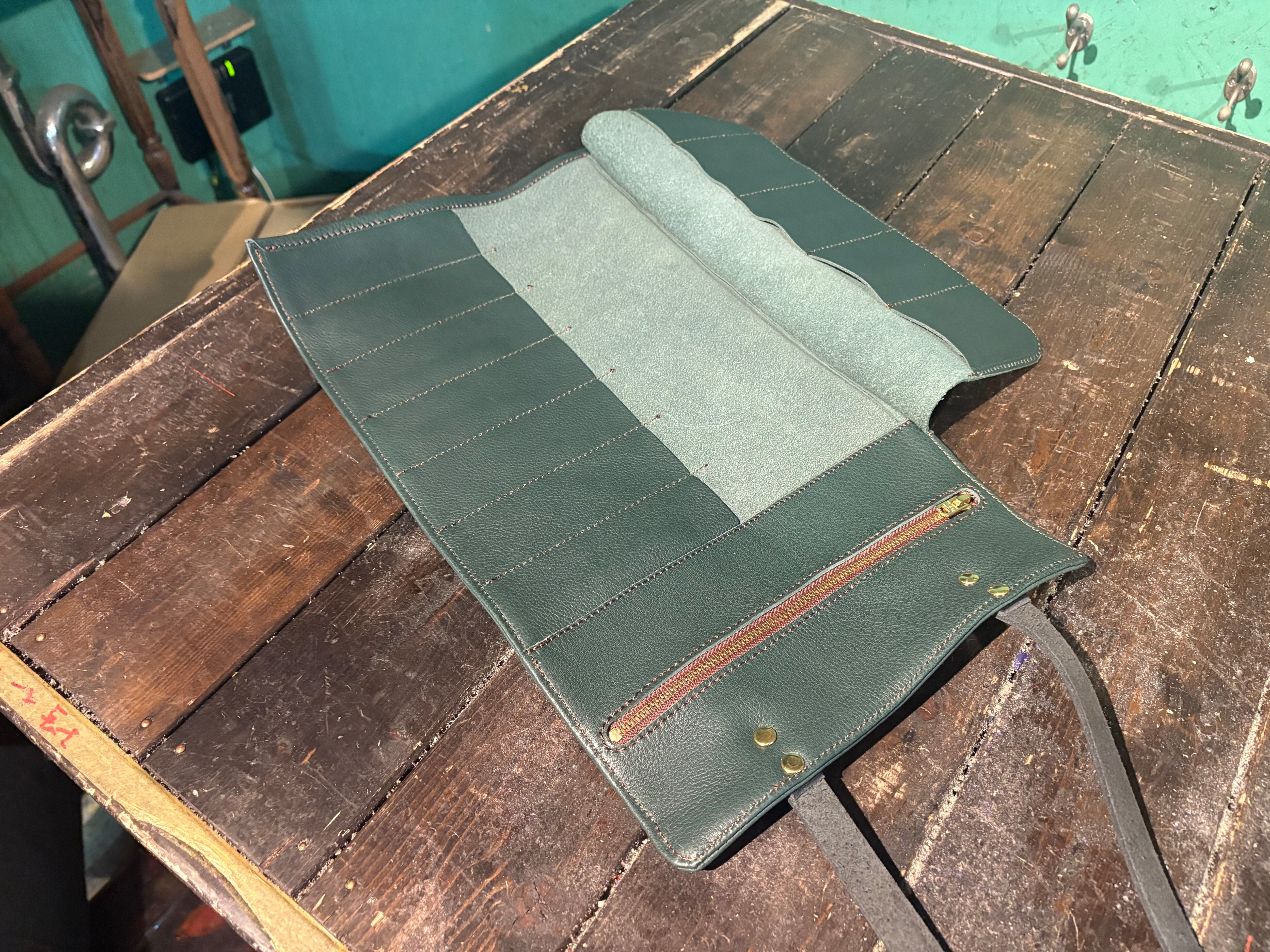 緑の革に茶色のステッチを使ったツールロールを作ってみました